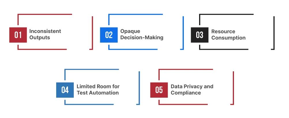 Common challenges include non-deterministic outputs, model hallucinations, bias risks, data privacy concerns, high compute costs, and limited automation. Enterprises also struggle with explainability, regulatory compliance, and validating contextual accuracy, which makes traditional QA approaches insufficient for GenAI systems.