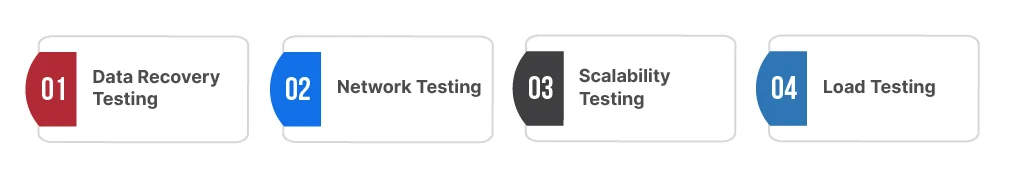 These tests validate transaction speed, system stability under peak load, performance across networks, and the system’s ability to recover from failures in cloud environments.
